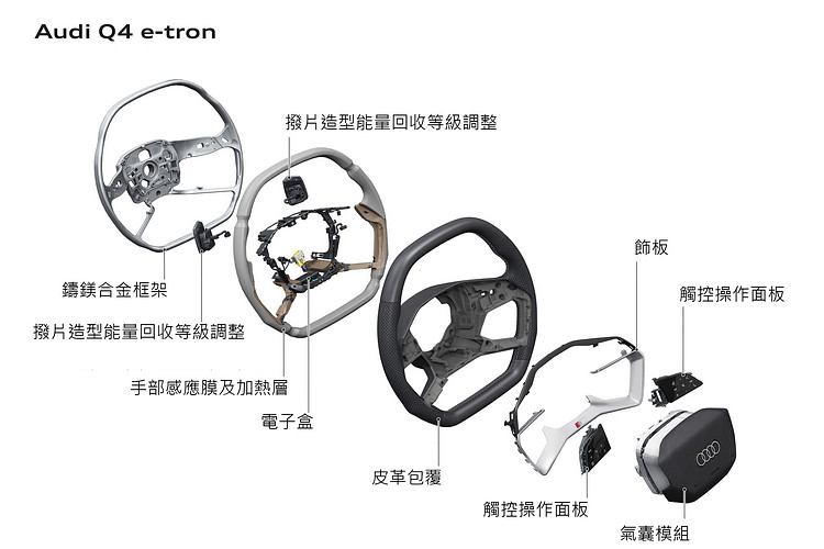 ▲早期的Audi 80使用的方向盤,除了轉向和喇叭幾乎沒有其他附屬功能,如今Q4 e-tron GT方向盤的用料材質與造型全面革新,早已成為車輛運作的重要核心。