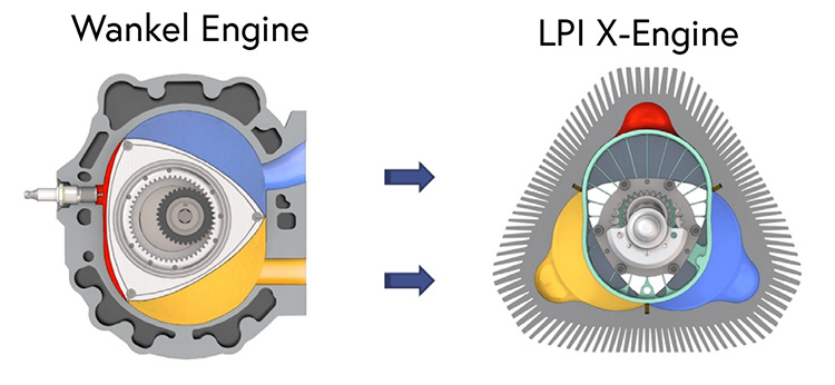 LiquidPiston公司位於美國康涅狄格州,自主研發及製造的X-Engine,本質上同樣屬於高效率混合循環的Wankel轉子內燃機設計,一樣有三面弧形缸壁,但缸體和轉子的造型與Mazda所用完全相反,是以三角形缸體搭配橢圓形轉子來運作,並透過中央殼槽的環齒,藉由驅動與之嚙合的行星齒軸偏心旋轉來輸出動力。