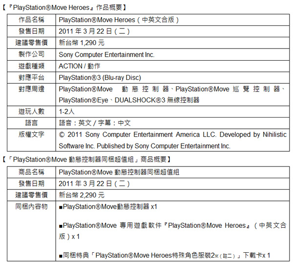 Sony Computer Entertainment Taiwan Limited 今日宣布將於 2011 年 3 月 22日(二)推出 PlayStation®3 (PS3) 專用遊戲軟件『PlayStation Move Heroes』(中英文合版),同日並將推出搭配本作的「PlayStation Move 動態控制器同梱超值組」,數量有限,千萬別錯過!