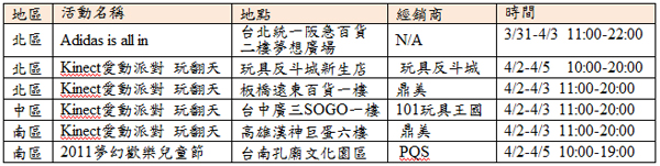 ![]() 除了Xbox LIVE的優惠折扣之外,本週六4月2日(六),知名藝人小禎將帶著阿寶一同前往玩具反斗城新生店體驗Kinect全身體感的魅力,想和藝人挑戰體感遊戲嗎?各位千萬不可以錯過!春假期間多場Kinect愛動派對,就是要讓全家大小體感動起來!