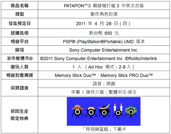 Sony今日宣布PSP專用遊戲軟件『PATAPON3 戰鼓啪打碰3』(中英文合版)將於2011 年 4 月 28 日(四)隆重登場!為了感謝廣大喜歡『戰鼓啪打碰』系列作的朋友們,將提供遊戲(UMD版)初回生產限量特典「特別頭盔組」,數量有限,送完為止喔!