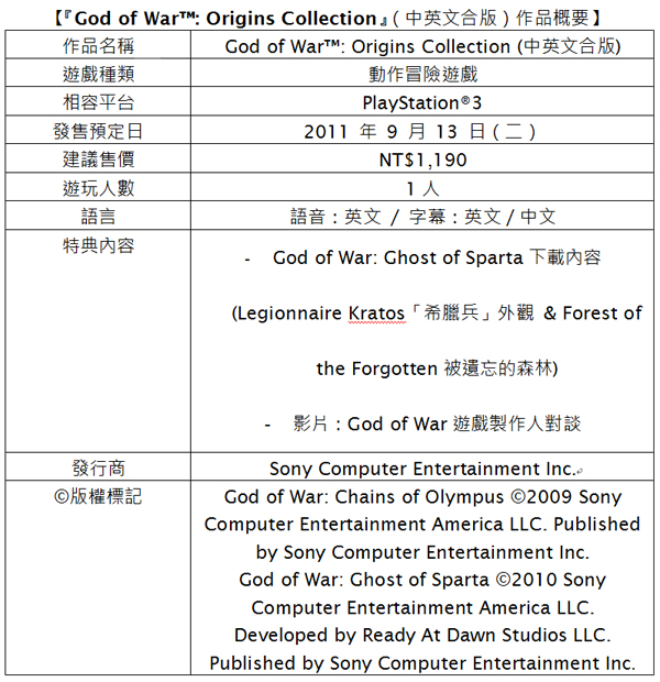 Sony Computer Entertainment Taiwan Limited (以下簡稱SCET)今日宣布將於2011年9月13日(二)推出PlayStation3專用遊戲軟件『God of War : Origins Collection』中英文合版,收錄PSP (PlayStation Portable)平台的『God of War : Chains of Olympus』與『God of War : Ghost of Sparta』兩件作品,以高畫質呈現。