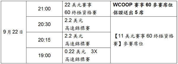 想要挑戰WCOOP線上撲克世界冠軍賽,現在還有機會,最後一場【亞洲終極資格賽】在9月22日,晚上台灣時間7點展開: