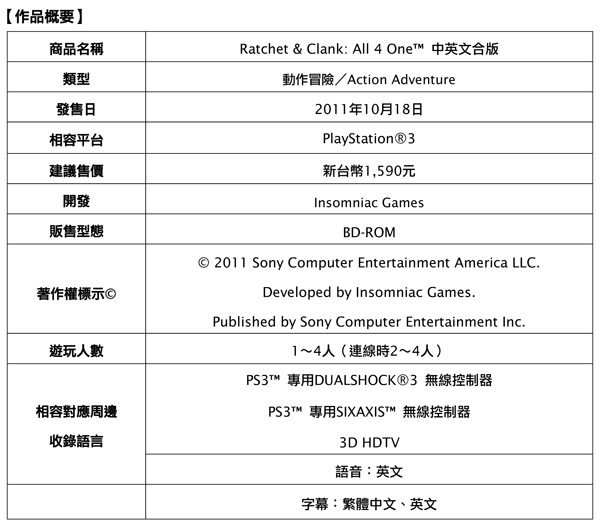 SCET將於2011年10月18日,於亞洲地區發售PlayStation3專用遊戲軟件『Ratchet & Clank: All 4 One(拉捷特與克拉克 All 4 One)』的中英文合版。