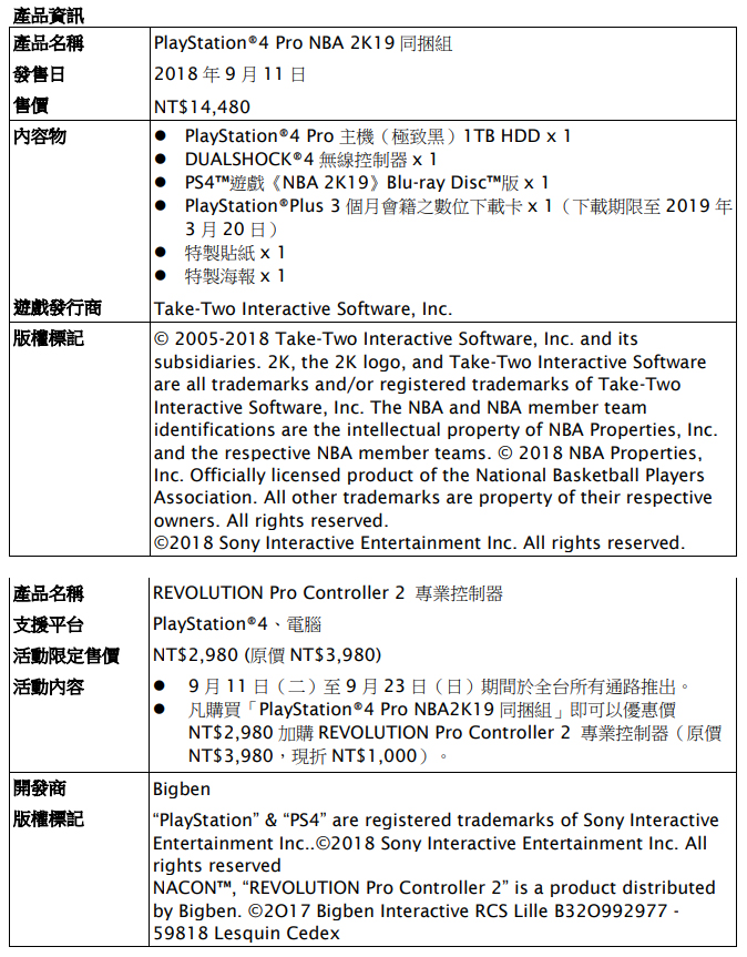 同時,為慶祝《NBA 2K19》發售,SIET將於9月11日(二)至9月23日(日)期間在 全台所有通路推出特別活動。凡購買「PlayStation®4 Pro NBA 2K19同捆組」即可以優惠 價NT$2,980加購REVOLUTION Pro Controller 2 專業控制器(原價NT$3,980,現折 NT$1,000)。