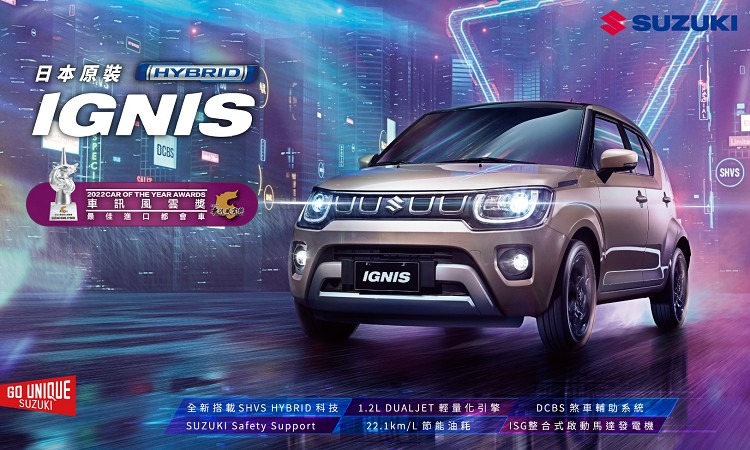 IGNIS以經典時尚的設計理念,將掀背功能與SUV車型完美結合,車室空間以水平線延伸出遼闊舒適的視覺感受,後座採6/4分離式設計,隨心變化出最大501L的收納空間。透過SUZUKI Safety Support及DCBS煞車輔助系統等安全科技配備打造出極智行車守護。動力方面,IGNIS全新搭載SHVS HYBRID輕油電科技與全新1.2L DUALJET引擎,創造平均油耗22.1km/L的一級能源效率,此外,1,197cc最小級距排氣量,造就IGNIS稅金與燃油的雙效節能表現。