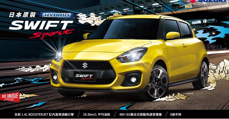 SWIFT Sport可謂SUZUKI車系中的性能小超跑,以更性能化的設計彰顯其強悍本事。搭載HYBRID 輕油電科技,結合48V ISG整合式啟動發電機與鋰離子電池的SHVS智能混合動力車,搭配1.4 L BOOSTERJET缸內直噴渦輪增壓引擎,造就最大馬力129.2ps與最大扭力23.9kgm的狂猛動能。結合首度導入的6速手排配置,加上SUZUKI Safety Support全面的主動安全守護,讓您在車道能更無慮地釋放速度與激情。
