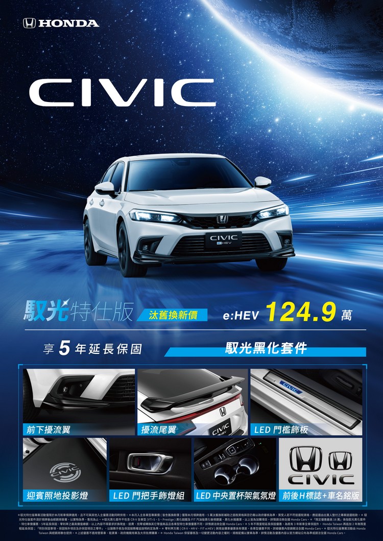 即日起~12/31止入主CIVIC e:HEV次世代電油車享「馭光特仕版」黑化套件組,包含「前下擾流翼、擾流尾翼、LED門檻飾板、迎賓照地投影燈、LED門把手飾燈組、LED中央置杯架氣氛燈、前後H標誌+車名銘版」,再享「5年延長保固」與汰舊換新價124.9萬元,總價值高達16萬元的限時豪禮,成就買家獨具魅力的零里程焦慮駕乘體驗。