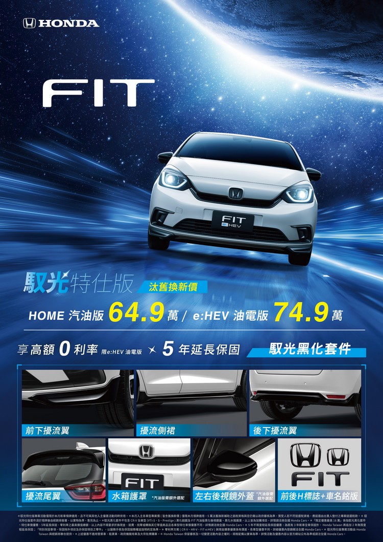 即日起~12/31止入主FIT HOME汽油版或節能省油王FIT e:HEV油電版免費升級「馭光特仕版」黑化套件組,包含「前下擾流翼、擾流側裙、後下擾流翼、擾流尾翼、水箱護罩*2、左右後視鏡外蓋*2、前後H標誌+車名銘版」、「高額0利率*1」、「5年延長保固」,HOME版再享汰舊換新價64.9萬元、e:HEV版74.9萬元的限時優惠,讓預算型買家購車零負擔。