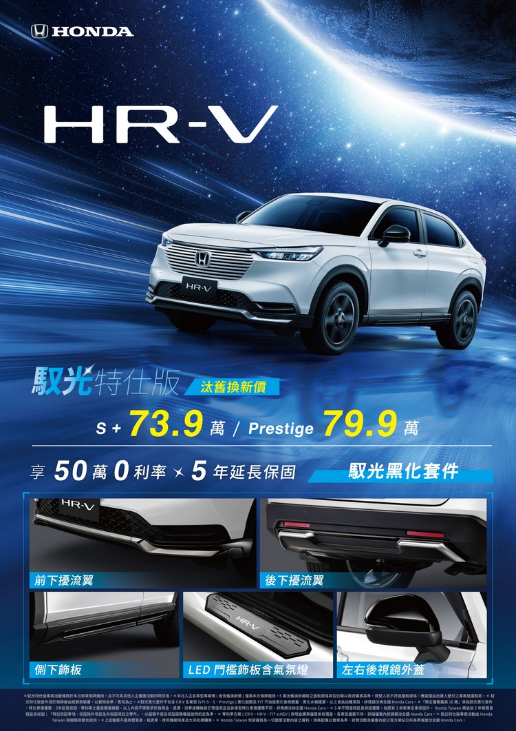 即日起~12/31止入主HR-V全車型限量免費升級「馭光特仕版」黑化套件組,包含「前下空力保桿、後下飾板、側下飾板、LED門檻飾板含氣氛燈、左右後視鏡外蓋」,另享有「50萬0利率」、「5年延長保固」優惠好禮。HR-V S+ 再享汰舊換新價73.9萬元、Prestige 79.9萬元的限時優惠,讓消費者輕鬆擁有獨樹一格的都會CROSSOVER跨界跑旅,體驗無與倫比的駕駛樂趣。