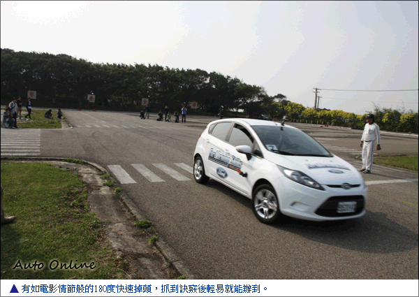 甩尾失控體驗跟180度快速掉頭![]() 這兩項關卡不會出現在一般民眾的課程之中,因為安全考量所以只有在媒體體驗營中出現。甩尾失控體驗就是俗稱的甩尾,在入彎前拉手煞車讓後輪鎖死車尾甩出,這時候需要持續踩油門讓前輪有抓地力跟指向性,修正方向盤讓車輪維持要走的方向。最常碰到的問題就是駕駛忘了持續加油讓車輛沒有前進動力,車輛反轉180度,或者拉手煞車時機不對無法真正體驗到車尾失控的學習,車速過快無法及時修正而衝出跑道的錯誤也有媒體編輯發生。