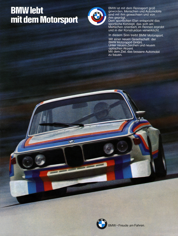 BMW Motorsport GmbH於1972年5月1日正式接下BMW在賽車領域的挑戰,初期共有35名員工,領航者則是總監Jochen Neerpasch,它曾做過PORSCHE的廠隊車手也當過FORD的賽車部門總監,是位經驗豐富的老手。數月後他們搬進鄰近慕尼黑工廠,佔地8000平方公尺,擁有維修與研發工作室與賽車引擎生產線的Motorsport GmbH總部。