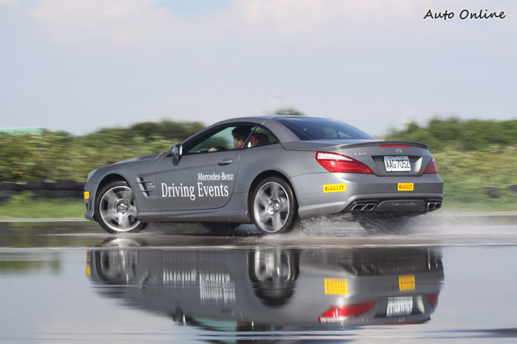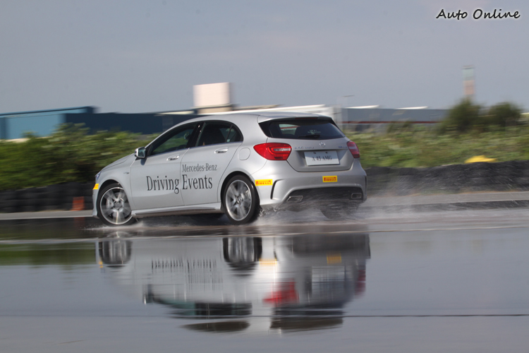 ![]() ▲關掉ESP的E63和CLS63,控制油門的細膩度要求極高。換上E63 AMG再試試,Violetta Weykopf教練不斷提醒這部超過500hp馬力的猛獸必須格外小心油門控制,果不其然,後輪才進入溼地,一打方向盤立刻像打水漂般甩到右邊,此時PRE-SAFE系統作動下,安全帶明顯感受束緊,用力踩下煞車踏板,才能阻止車輛繼續打轉。重新出發嘗試,靈敏的油門反應很容易輸出過大動力,又花了很大的功夫才將車輛開往終點。 ![]() ▲即使面對濕滑路面,A45 AMG也鮮少出現完全失控的狀況。![]() ▲教練建議,一旦失控最好的方法依舊是踩死煞車。