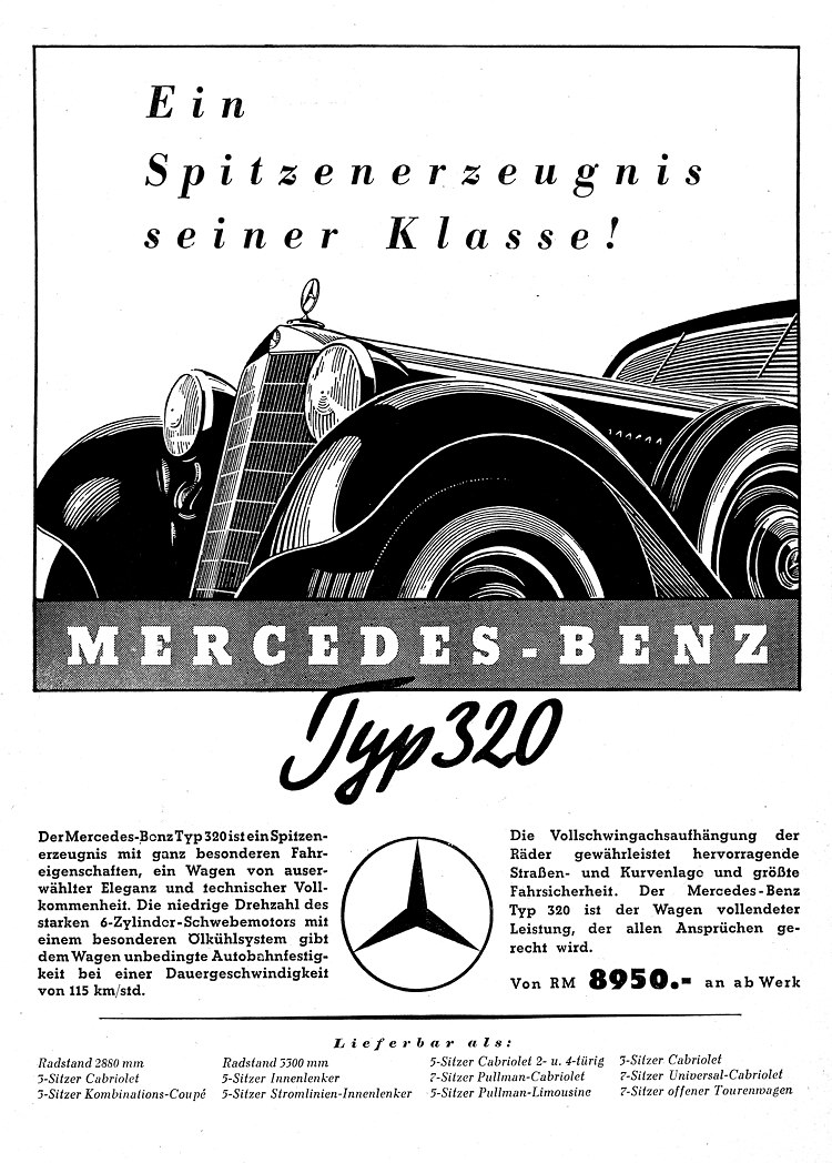 ▲刊載於1938年德國雜誌上的Mercedes 320(W142)廣告:「Top of its class! Mercedes-Benz 320」