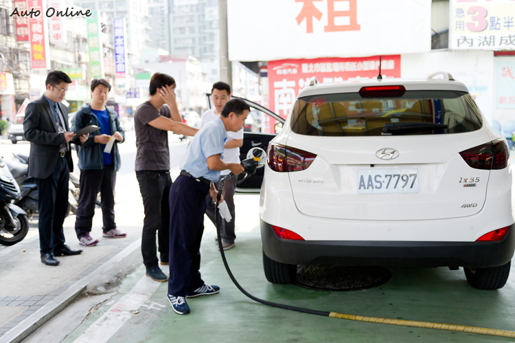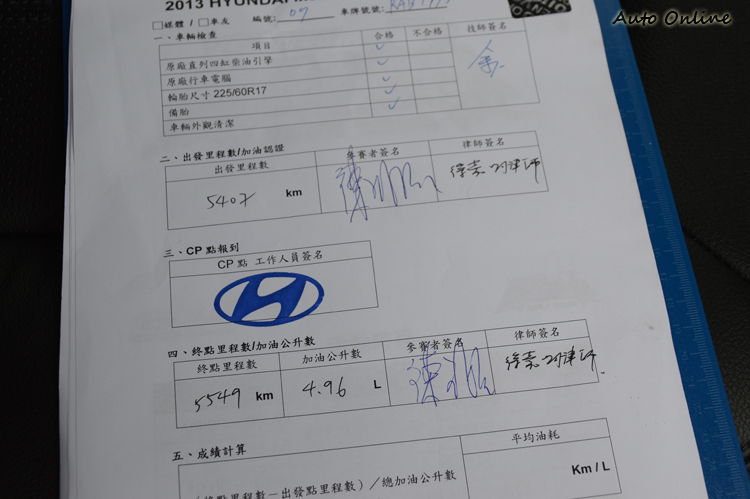 ![]() ix35 VGTurbo搭載了HYUNDAI 新世代2.0L「R-Type柴油引擎」,除了擁有184ps最大馬力及40kgm扭力峰值外,為了看看ix35 VGTurbo倒底有多省油,總代理舉辦了一場極限省油王比賽,除了找來ix35車友外,參賽者還有專業的汽車媒體,大夥在律師的見證來看看倒底誰才是極限省油王。 ![]() ▲比賽由台北內湖的新民展示間出發,行經國道、省道,總里程約140公里。![]() ▲比賽前後皆在律師的見證下加油,總行駛里程除以所加的油量即為這是比賽的平均油耗。![]() ▲特殊的油箱封條只要撕毀或是遇水都會有浮水印顯示,比賽過程相當公正。![]() ▲車上包括備胎等原廠配備在中途點休息時都還要再檢查一次,不容偷機取巧的情事發生。