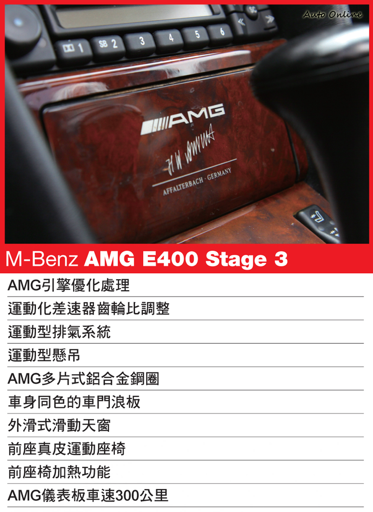 ![]() ▲當代的M-Benz車頭方正,就是有人特愛這種感覺。外觀同樣以當時400E為基礎,換裝AMG前後大包、側裙以及車門浪板,S2與S3就差別在車門浪板的顏色,S2是與車身不同色,而S3則會將浪板烤漆與車身相同顏色。 ![]() ▲AMG E400 Stage 3鋁圈採用AMG雙片式大餅框,車側浪板與車身同色。![]() ▲核桃木飾板是當年高級車必備品,就算是標榜性能的AMG E400也一樣。![]() ▲前座椅換上兩張AMG包覆性好的運動化座椅,但還是保有M-Benz該有的舒適性。![]() ▲後座座椅泡棉柔軟舒適,不虧是當年賣最好的M-Benz。![]() ▲時速表底300km/h,想證明請拿出那個心臟。![]() ▲冷氣空調控制介面簡單,下方還保有卡式的音響主機。![]() ▲後行李廂空間方正,高爾夫球具兩組都不是問題。