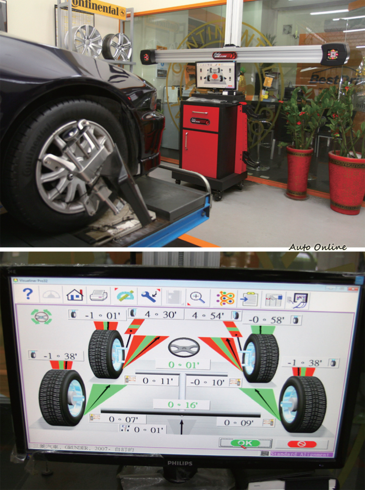 ▲輪胎平衡後,四輪定位也絕對不能少,不正常定位角度會讓輪胎快速磨損。