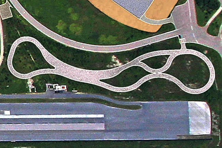 (一)動態平台操安測試區主要測試區塊為一扇形鋪面的平台,內含最大迴轉區域為半徑60mm之路徑,並包含進入該測試平台的直線加速道。因具有廣闊測試面積,可執行較激烈或需較大緩衝空間的操控測試,例如車輛動態穩定系統測試項目之正弦定頻試驗(Sine With Dwell)。