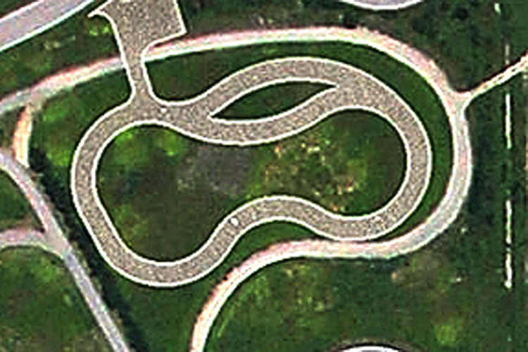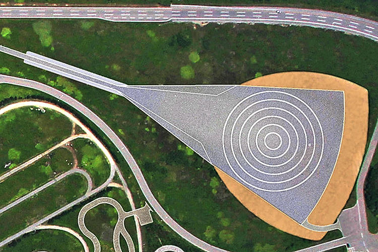 (三)濕地操安測試區<05> 由半徑20m及40m圓弧串接而成,路面摩擦係數約0.6~0.8,並設置灑水設施可模擬行駛濕滑路面情境,進行車輛於低摩擦路面的操控性能主觀評價測試。
