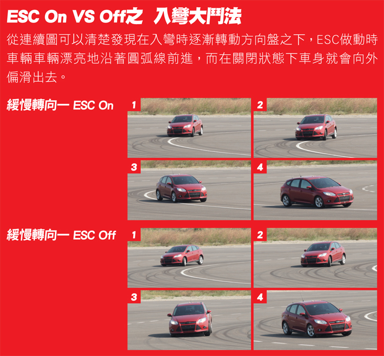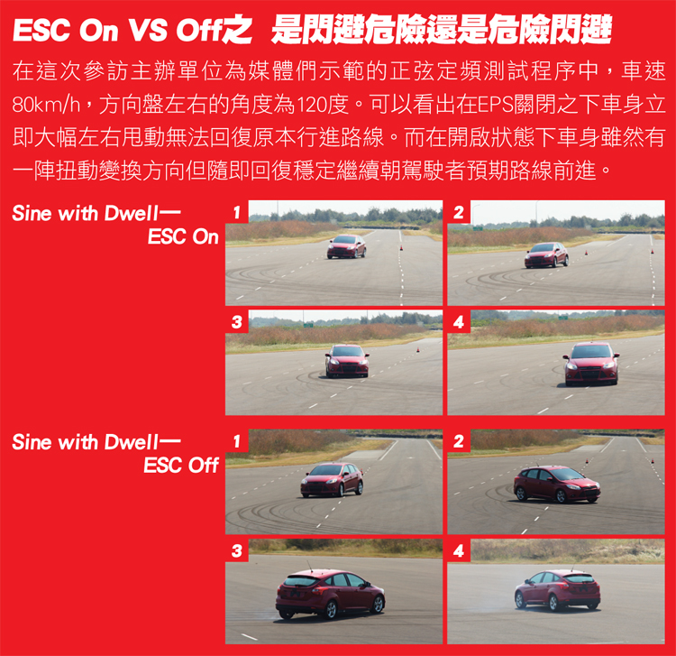 實際測試示範登場!在實際進行ESC系統評價時會包含緩慢增加轉向程序與正弦定頻(Sine With Dwell)測試,其中緩慢增加轉向程序是讓車輛在80km/h定速行駛中逐漸以13.5度/秒的速度提高方向盤轉角,讓車輛以螺旋軌跡行進,每次當側向加速度達0.5g時停止。測試6次線性回歸取得側向加速度0.3g之方向盤轉角A值,這個A值每部車款不同。