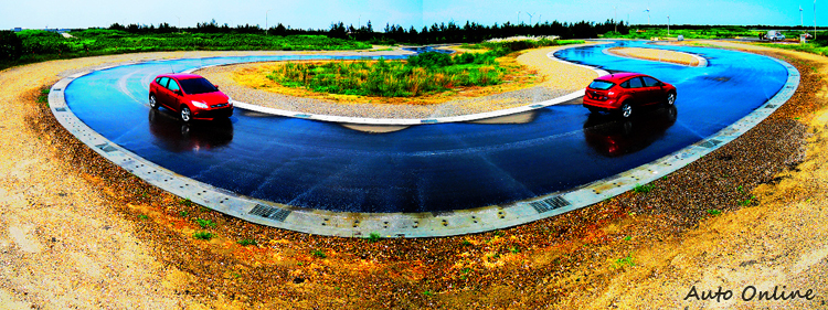 (二)乾地操安測試區由半徑20m~140m的圓弧串接而成,路面摩擦係數約0.9,並設置半徑100m、長10m圓弧、積水1cm旋迴水漂車道,可進行車輛操控性能主觀評價及轉彎水漂測試。