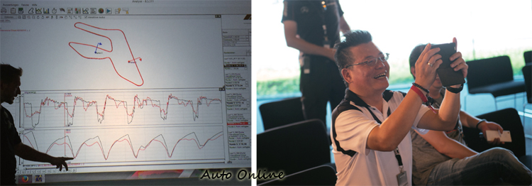 ![]() ▲AMG GT S超長車頭、短車尾的設計開起來會不會怪怪的?不會,而且很靈活。轉向比左右不到兩圈半,全程握住3點9點位置即可。以教練前導的入彎速度,車身非常穩定,煞車力極強。下午課程則進入彎道攻略,將路線切分為兩段進行講解與練習,在AMG GTS車上安裝賽車記錄器,每個學員駕駛完之後進入教室,教練一一播放畫面並講解路線與駕駛姿勢等細節,其中不少老資格的媒體也被抓出雙手沒有固定3點9點位置的壞習慣而做了多餘的動作,受益良多。 ![]() ▲前導車ML63 AMG為教練專屬,在練習前導引學員熟悉場地用。![]() ▲看一行人兩手空空,認真參加訓練是沒什麼時間拿相機的,幸好專屬攝影師幫我們拍了所有的照片,得以專心學習。![]() ▲每個AMG教練都是職業賽車手,烈日下悉心指導學員,非常辛苦。珠海賽道氣溫和台灣南部一樣熱,動輒35度C。![]() ▲兩人一組輪流開車,同組的是Go車誌的朱嘉偉,多年前的老同事,他這次贏得了Auto-X競賽的冠軍,名不虛傳。![]() ▲GT S賽道完成單圈後,在教室進行數據分析,黑色線條是教練車的成績,紅色是我的。教練解說時挺風趣,逗得大家哈哈大笑。