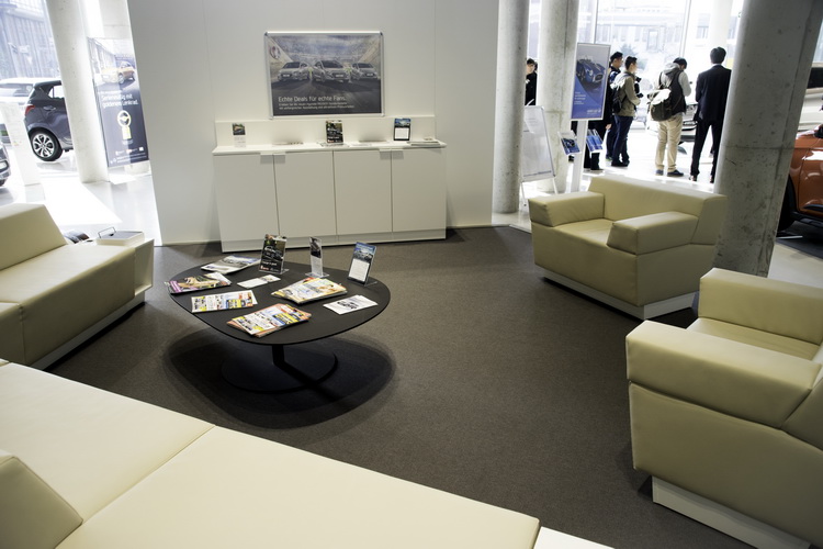 展間內提供銷售業務與消費者數位化、智慧化的商談空間,例如桌面的數位觸控設計、數位式規格顯示板、平板電腦、銷售app、多媒體顯示牆等。除了展間面積比國內大以外,在設施上與高雄博愛旗艦店是沒有什麼差別的。值得一提的是,在交車的時候車子是放在旁邊有沙發椅的交車室內,讓車主在拿到新車時心中有備受尊重的感覺。