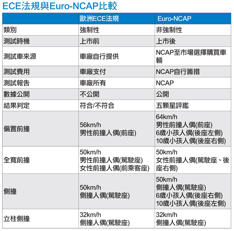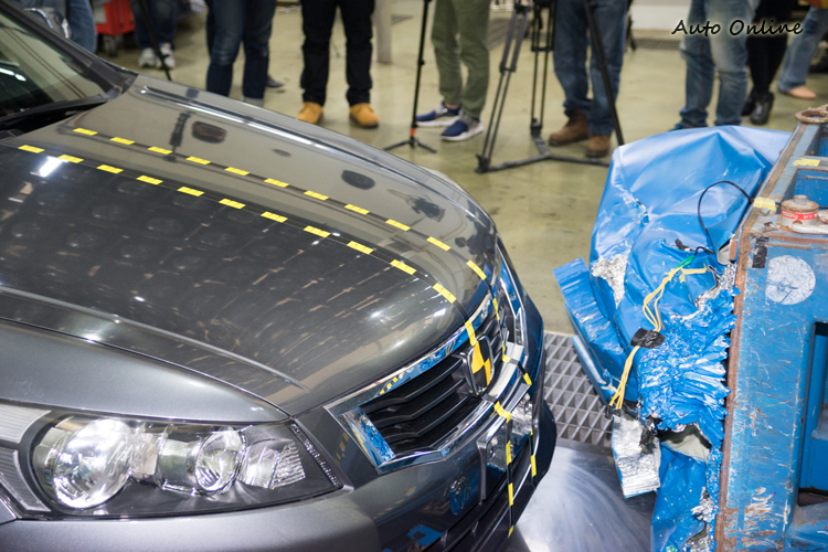 你要看政府公布的法規撞擊測試? 還是NCAP機制下的測試評鑑?![]() ▲台車前方用於撞擊的蜂巢鋁車頭是全球統一規格。另一個大家容易混淆誤解的部分,就是對於「法規撞擊測試」與國外「NCAP撞擊測試」之間的差異。全世界各國,包括台灣在內都會要求車廠/商的車輛必須符合該國的碰撞要求後才能上市銷售,這是政府對於車輛安全做的基本把關,所得出的結果也只有通過與不通過之分。如果硬要將法規撞擊測試的所得到的結果拿來看的話,以這次在ARTC所看到的實際資料來說,複雜的公式計算所得出的數據對消費者來說很難看懂,只能粗略地說能通過法規測試的話,表示在一般安全駕駛車速之下遇到突發撞擊事故之下,車內乘員所受傷害會在美國安全工程師協會所提出的AIS傷害分級中在第二級(單純性骨折)以內。 ![]() ▲前方碰撞測試是測試車以56km/h撞擊涵蓋車寬40%的駕駛側前方治具,雙前座各放一人偶。![]() ▲治具後方的牆經過強化,重達80噸,確保不會吸收掉撞擊能量。