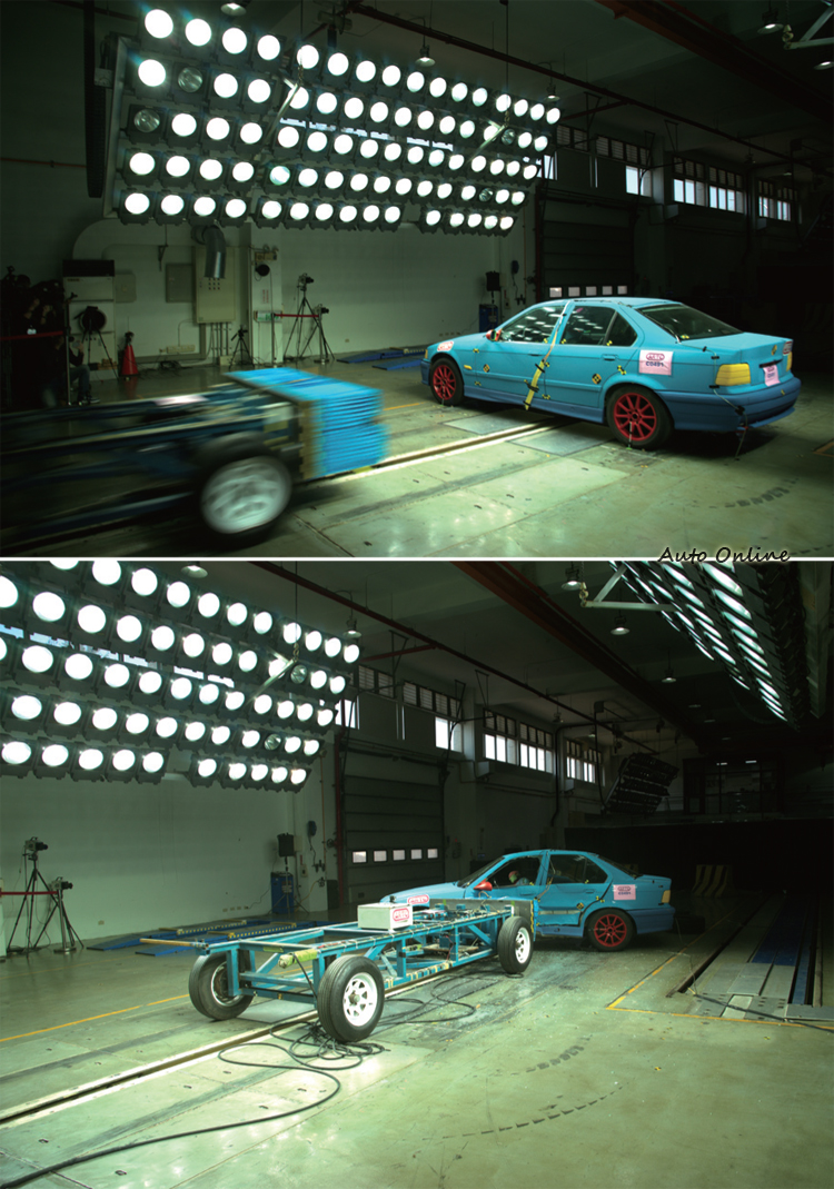 ![]() ▲車身各部位貼上貼紙方便確認位置也是準備工作之一。在這裡就有幾點要跟大家解釋一下,首先,ARTC是半官方色彩的機構,並非審驗車輛是否可以掛牌上路的政府單位。當車廠/商將送測車輛送至ARTC後,ARTC的工作就是按照法規規範進行測試(在這裡我們就焦點集中在撞擊測試好了),並將測試後的結果數據交給廠商以及自己留存一份備查(VSCC、法院等),因為這個測試是廠商花錢請ARTC做的,所以等於是車廠/商的財產,ARTC本身自然無權公布,就好像病人花錢去醫院看病,醫院無權公布病人病歷資料一樣。 ![]() ▲側方碰撞測試是台車以50km/h撞擊測試車駕駛側的側面(駕駛座放側撞人偶)。