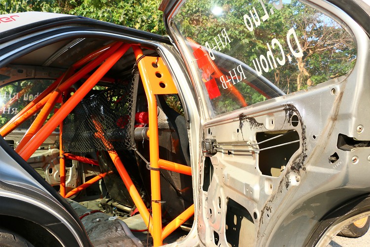 底盤、動力進化後,接下來最重要的就是安全配備。車內因應美觀的內裝飾板、隔音地毯全數移除,達到輕量化及安裝車內防滾架空間。防滾架由台北日盛小李操刀,依照賽事規定有焊接點數的規範,目的是預防撞擊造成車內車手的傷害。另外,賽車桶型座椅、六點式安全帶、賽車防向盤、滅火器、安全窗網、斷電開關等,都是最基本對於賽車的安全要求。