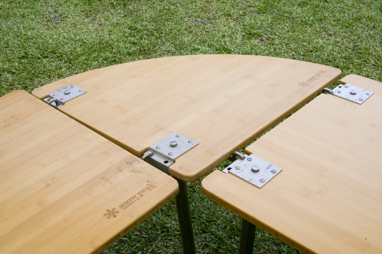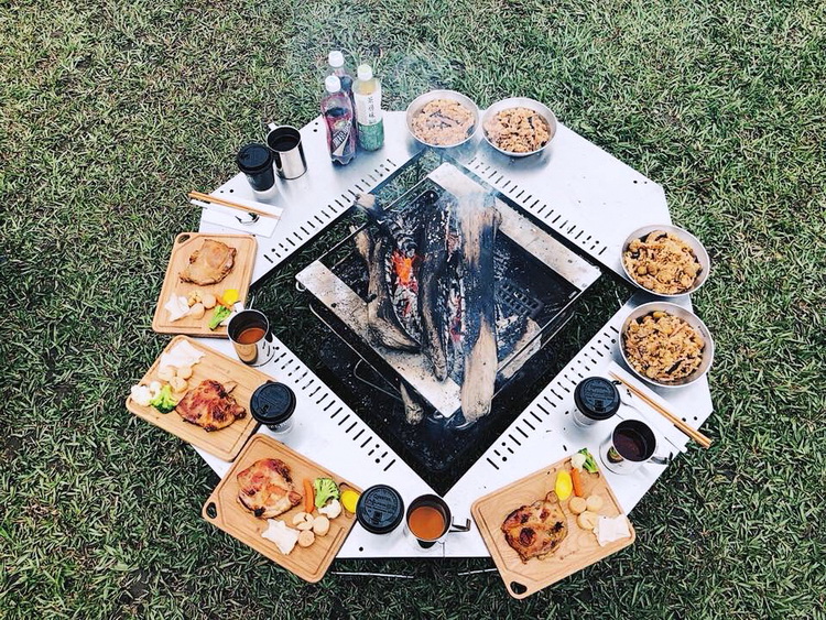 至於每道菜的料理與擺放,就使用Snow Peak的Iron Grill Table(以下簡稱IGT)餐廚系統,IGT是以鋁框架為基礎,可配合人數與風格、調理場景來滿足不同使用需求的餐廚系統。像我們有需要站著料理的,就使用830mm高的桌面,用來供人取用或坐在椅子上用的菜就方低一點的660mm桌面。透過不同框架大小、桌面高度以及桌板延伸、爐具炊具等,輕鬆創造出方便大家烹調料理與取菜的餐廚空間、