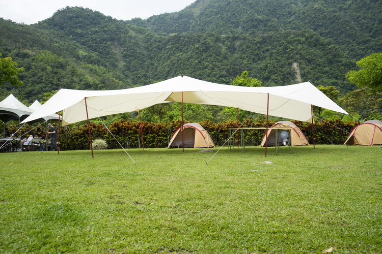 每年必來那山的我們,四月份再度揪集了6、70位露友,包下那山那谷場地,而且既然揪了那麼多朋友,當然各帳家庭不是各玩各的,那多無聊。我們訂下規則,每帳都得準備一道菜,晚餐時間就一起拿出來共同分享,這樣才有一同歡樂的氣氛。 為了幫我們實現把晚餐弄得跟個Buffet Party一樣的活動計畫,我們特別向那山的小陳老闆商請,租用了多項日系登山露營用品第一品牌-雪諾必克(Snow Peak)的用品。首先是將兩個大面積的六角蝶形天幕相接把我們的「會場」給撐起來,提供絕佳的遮風避雨能力,也有十足的開闊感,從外面看起來還很漂亮。