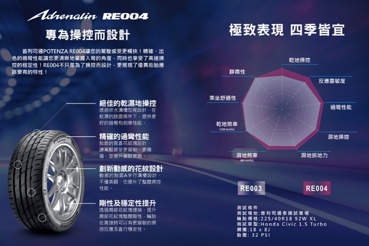 實際測試針對2016年Mazda 3選擇225/45R18規格,比起原廠所配備的215/45R18大了一點點,但對於車輛平衡性沒有差異,反而會對抓地力更加有幫助。當然實際測試的第一項就是操控表現,原廠搭配2.0升直列四缸,最大馬力165ps / 6000rpm與最大扭力21.4kg-m/ 4000rpm,算是一輛有衝勁的日系轎車。換上RE004之後,可以感覺到過彎的極限又更高,前輪的轉向敏感度也變好,在山路上駕駛能更輕易的掌控車輛動態,輪胎胎面花紋可使壓力平均分配,不會因為胎塊變形而造成滑動。胎壁的支撐性也變好,沒有因為擠壓而造成車身不穩定,與先前原廠搭配的登錄普輪胎有很明顯不同。 ![]() ▲Mazda 3原廠搭配2.0升直列四缸,最大馬力165ps / 6000rpm與最大扭力21.4kg-m/ 4000rpm,算是一輛有衝勁的日系轎車。![]() ▲換上RE004之後,可以感覺到過彎的極限又更高,前輪的轉向敏感度也變好,在山路上駕駛能更輕易的掌控車輛動態。![]() ▲輪胎新裝磨合期約500公里左右,無法對於使用壽命有太多著墨。不過另一項原本讓人很擔心的胎噪問題,RE004也高標通過檢測。![]() ▲圓弧胎塊與平整的花紋塊設計,防止輪胎胎面變形,可在潮濕路面提供更高的接觸壓力與面積,達到濕地絕佳表現,很可惜這次沒有環境可以測試。![]() ▲普利司通POTENZA Adrenalin RE004就是一條CP值很高的輪胎,它可以同時兼顧性能抓地力、肅靜度以及濕地表現,符合有點熱血的性能玩家所有需求。目前台灣所販售的RE004尺寸從15吋到19吋,扁平比從55至35都有,之後會陸續導入更齊全的規格,消費者能依照自己愛車原廠輪胎做相同規格更換,也可以做尺寸更大的升級改裝,都會帶來最直接的樂趣提升。如果近期想要幫愛車換一組全新輪胎,不妨試試看普利司通POTENZA Adrenalin RE004,平易近人的售價再加上輪胎的優勢,絕對會是你換新胎的首選。