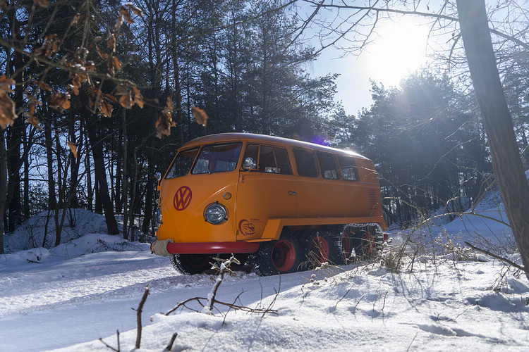 ![]() 這部車是在1962年5月於福斯的德國漢諾威工廠製造,出廠後就送往奧地利經銷商。原本它只是一輛正常的Bulli,但沒多久就被維也納一位名為Kurt Kretzner的福斯汽車技師進行改裝成這副模樣。Kurt Kretzner把它改造成具有四個車軸的T1,前兩軸配裝可轉向的車輪,後兩軸則裝上履帶機構,強悍的越野性能,甚至可以登上險峻的阿爾卑斯山雪地陡坡。