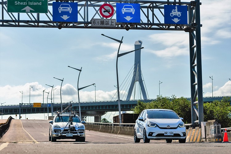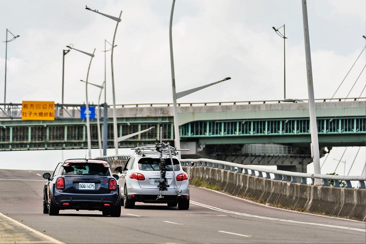 ▲特別在周日合法申請封閉社子大橋進行實際攝影演練,學員們駕駛著自己愛車進行跟拍演練。