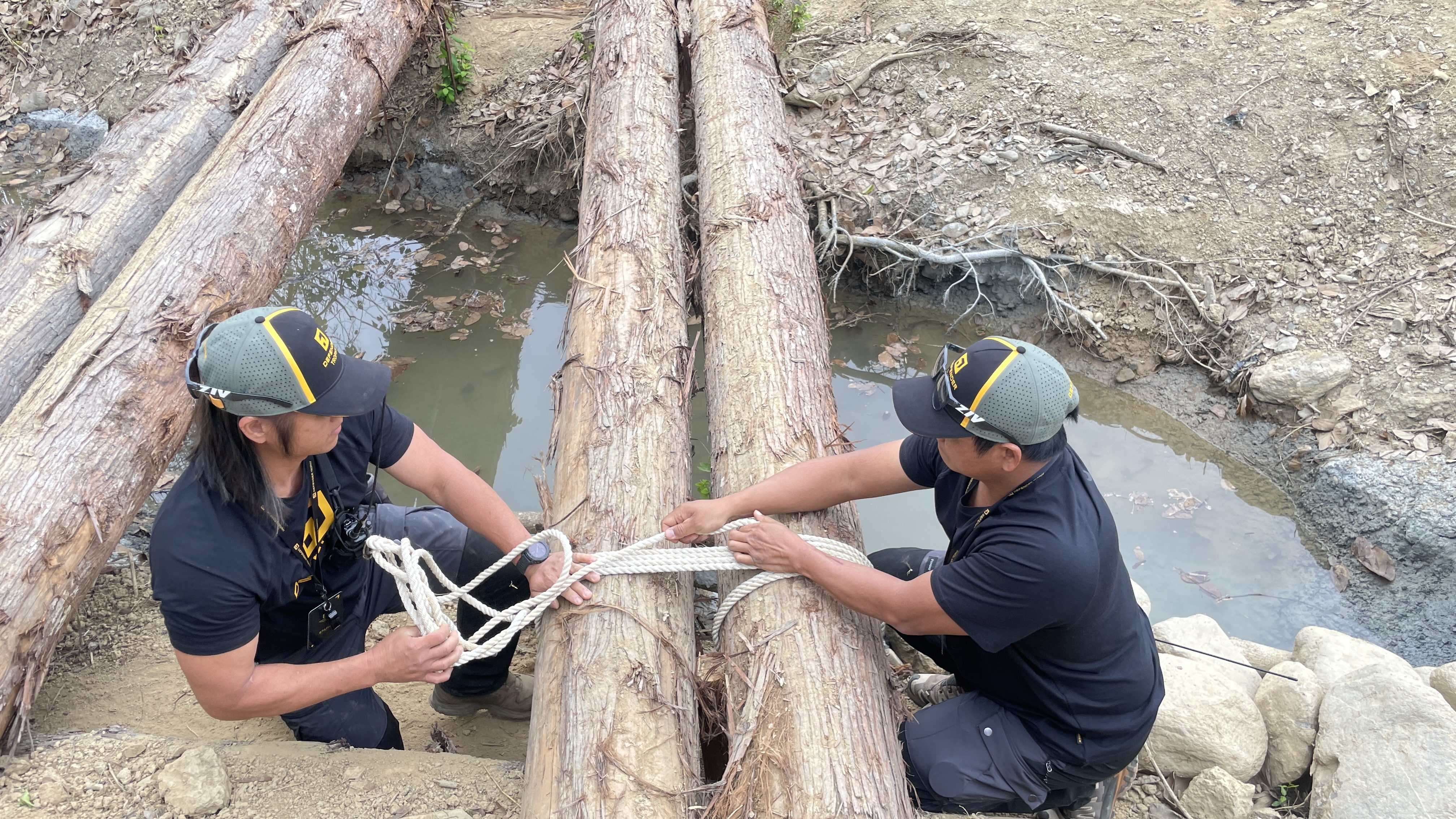 然而,真正的重頭戲現在才開始。越野技術好只是基本門檻,Defender Trophy 要考驗的是「人」的極限。另一項關卡是過獨木橋。這玩意對汽車線記者來說簡直沒有難度。但教官說獨木橋的木頭是鬆的,你們要自己綁緊,不然通過時車輛就有可能掉進溪底。 ![]() 雖然我常年在影片觀摩許多繩結的打法,但綁木頭真的還是第一次。因此這關除了車技外,還得考驗繩結與團隊協作能力。有人開車。有人負責指揮,有人綁繩結,這樣才能在時效內完成任務。 ![]()