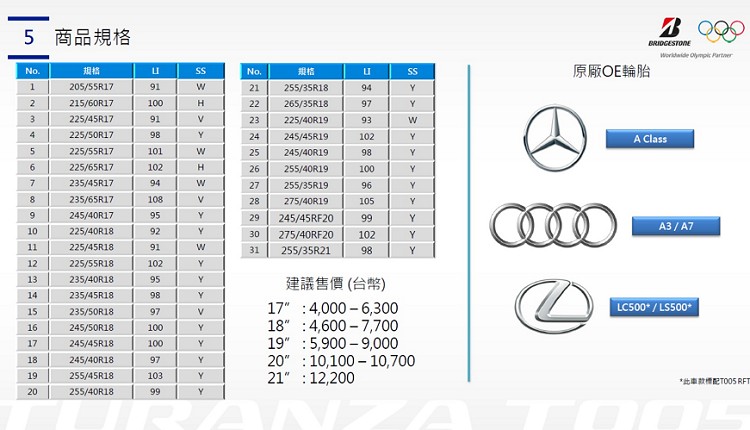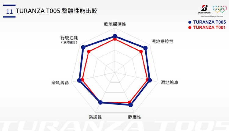 CP值爆表的TURANZA T005![]() ▲TURANZA系列為普利司通產品中標榜頂級舒適胎款,同時兼顧乾地操控、濕地操控、濕地煞車、肅靜性、舒適性、磨耗壽命以及行駛油耗。TURANZA系列為普利司通產品中標榜頂級舒適胎款,同時兼顧乾地操控、濕地操控、濕地煞車、肅靜性、舒適性、磨耗壽命以及行駛油耗,算是一條全方位輪胎,雖然每一項都不是最高分,但是在濕地操控性確實展現出它該有實力。在台灣最直接競爭對手會是米其林 primacy 4,但你問我這兩條胎哪條比較優異,抱歉我無法給你正面回答,就像活動當天問了Stefano Modena先生這個問題,他只帶來一絲竊笑說你試了就知道。台灣販售T005的規格從17吋到21吋,當然T001也會並行銷售,因為T001輪胎尺寸還是比較齊全,有興趣的朋友在八月就能體驗到它的全方位性能。