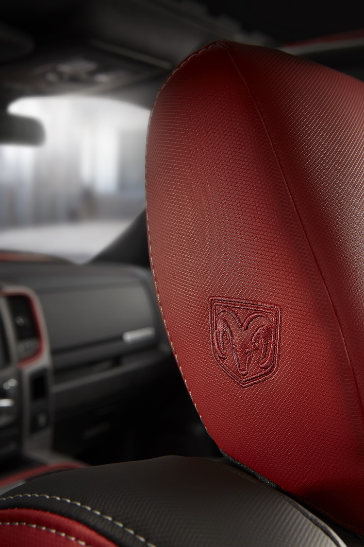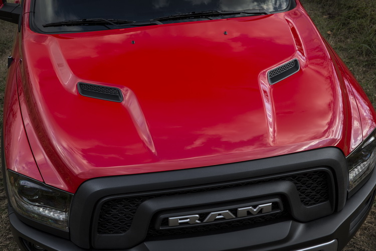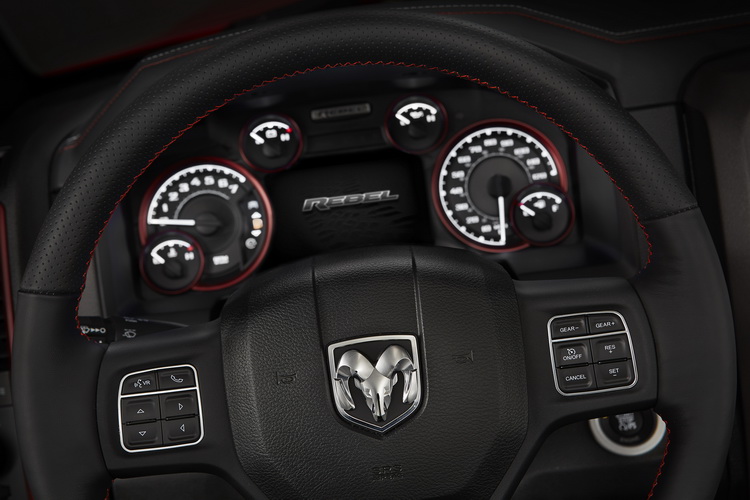 Ram 1500 Rebel在外觀上有著與標準車型不同的專用車頭設計,來強調更為剛猛的硬漢形象,。新式樣的黑色水箱罩中央有著大大的銀色RAM字樣,與RAM車系一貫喜用的十字設計大不相同。下方的越野式樣黑色保險桿採用粉體鍍層處理來提升耐用度,而且整合了同樣採用粉體鍍層處理的銀色下護板與前拖車勾、LED霧燈。整合了LED日間行車燈的遠近雙功能投射式頭燈燈殼則施予染黑處理。