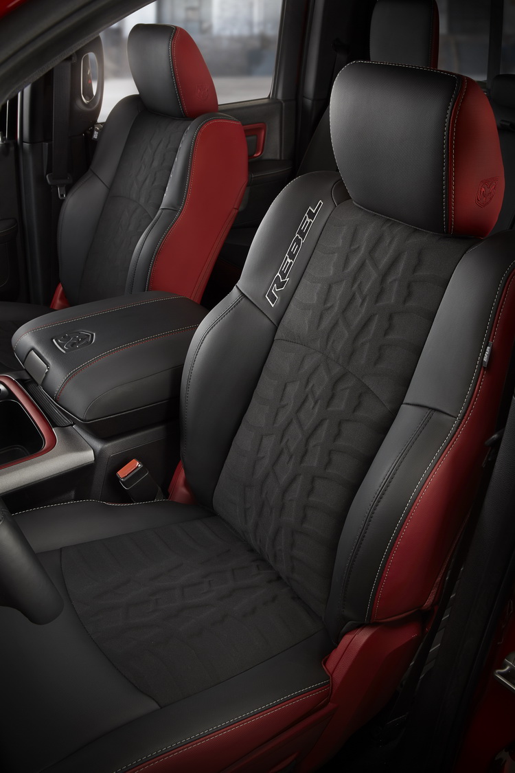車室內裝以方正線條為主調,呼應外觀的方正與粗獷。座椅採用高耐用度的乙烯基材質搭配Sedoso織布材質。椅身為紅灰雙色調且在肩膀處有黑底白邊的「REBEL」刺繡圖案,椅背與椅墊表面也有浮雕圖案。雙前座電熱功能則列為標準配備。