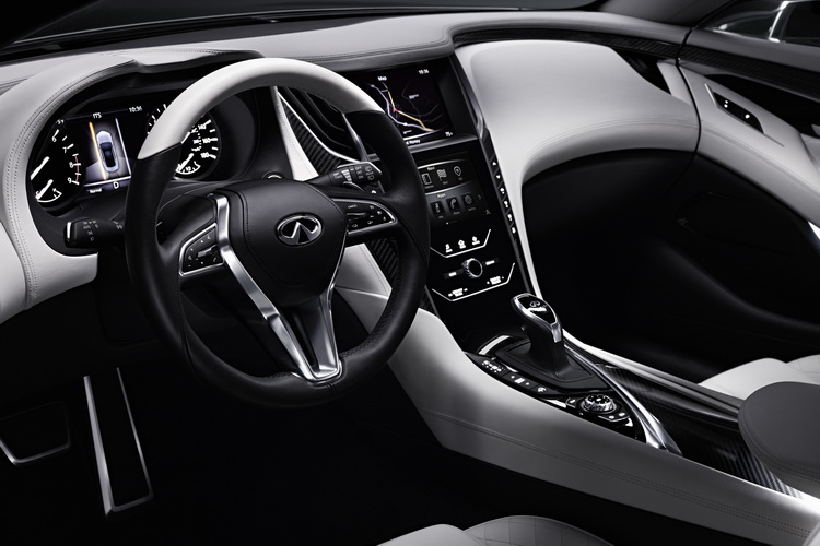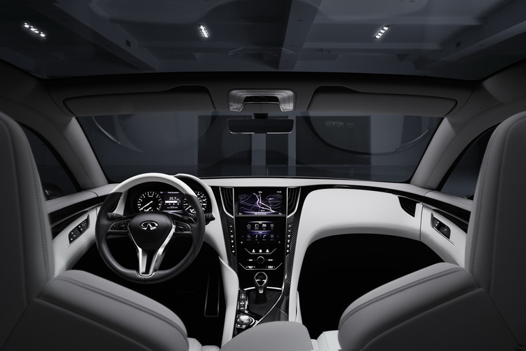 Q60 Concept車身尺碼為車長:4690mm、車寬:1865mm、車高:1370mm,車身比例偏向寬而低,車頂高度也刻意壓低。車室內裝大量使用手工縫製真皮、Alcantara複合皮革與碳纖維等高檔材質來鋪陳。室內空間與現行Skiline Coupoe相比,特別是在後座的腳步空間上會更寬裕一些,是更具有實用性的2+2座椅設定。