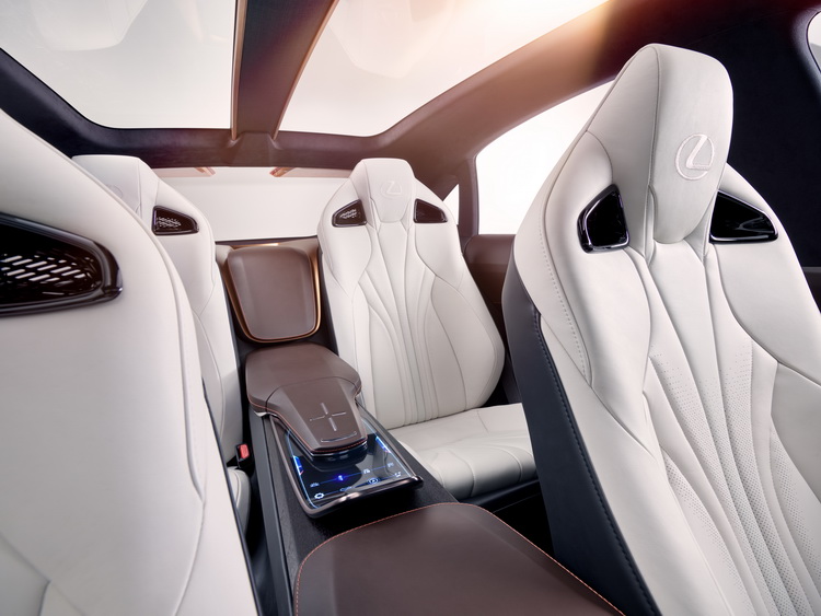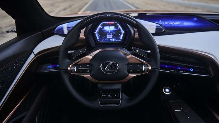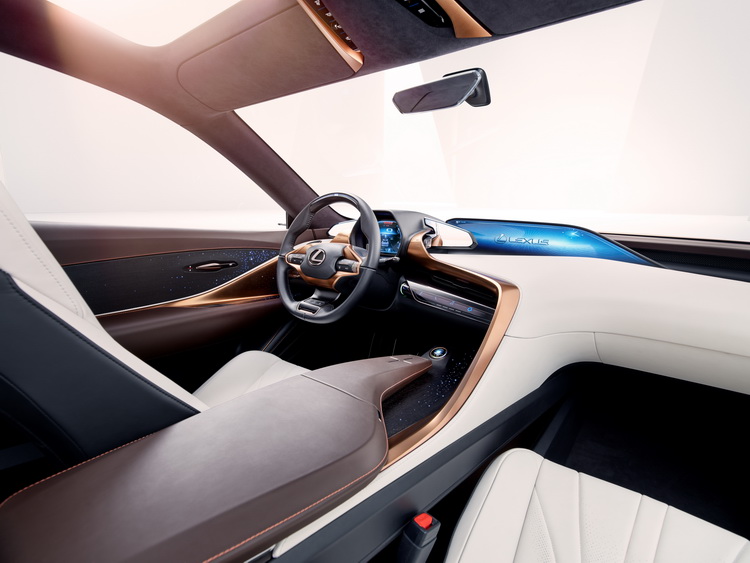 內裝飾板採用與外觀色相仿、融合玫瑰金與銅的色調,但藉由特殊緞面處理,增添一絲溫潤氣息;圍繞在儀表板上方及方向盤周圍的皮革則讓駕駛更能感受LF-1的跑車氛圍;而玫瑰金色飾板更與巧克力色的皮革裝飾及戚風白色座椅的結合,更呼應LEXUS 結合異材質呈現美感的Yet設計哲學。