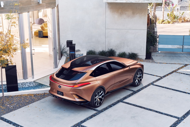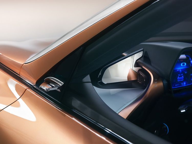 LF-1的肩線從引擎蓋一路延伸到D柱下方,雖然銳利,但完美地與下方前後葉子板的線條融合在一起,到後車門之處甚至有著如同美國經典肌肉跑車的可樂曲線瓶線條。車尾分離式後導流尾翼有非常高的吸睛度,在後保險桿兩端像排氣尾管的設計其實是提升空力性能的後輪氣流導流口;後輪上方的輪拱讓如飛翼般、向外突出的尾燈能安穩地座落於其上;而尾燈上方,則是拜分離式後導流尾翼之賜,由後座延伸到車尾、提供後座乘員寬闊視野的大面積玻璃車頂。