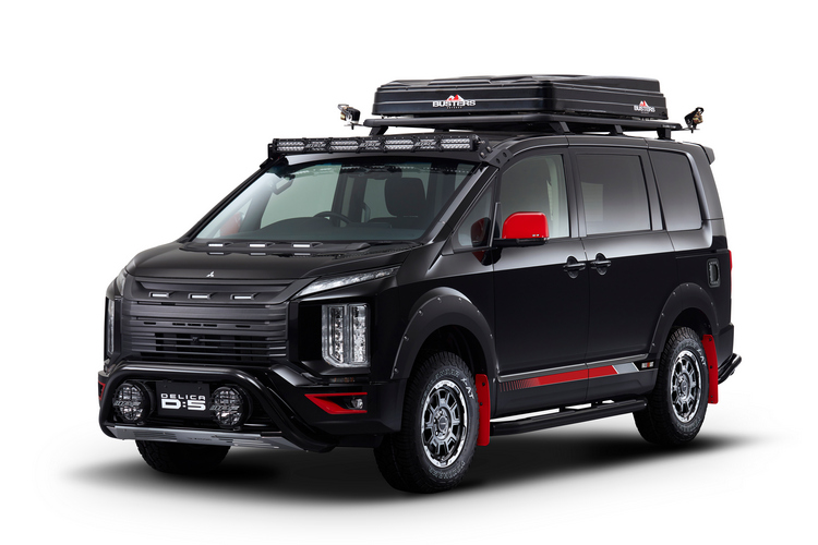 DELICA D:5 Tough × Tough多功能廂型車搭載了RALLIART與其他廠商的多項改裝配件,讓DELICA D:5立刻「Tough」起來。車頭水箱罩、前後防撞護板與輪拱護板都以消光黑處理來與黑色的車身色統一。再搭配紅色的後視鏡外殼、霧燈飾框、車側貼紙與擋泥板來凸顯視覺。避震器換上避震統與彈簧將車身提高,並換上16吋鋁圈與全地形胎。