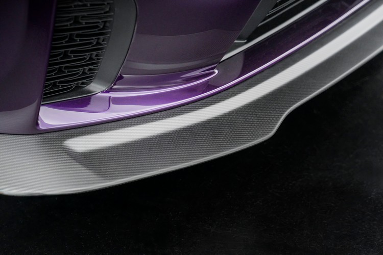 內裝方面採用 Katzkin 皮革混搭,並以托斯卡尼墨黑(Tuscany Ink black)和帕洛米諾棕(Palomino tan)的對比色調點綴。橘色和紫色的縫線則為車室增添最後一筆,使內外觀設計相互呼應。