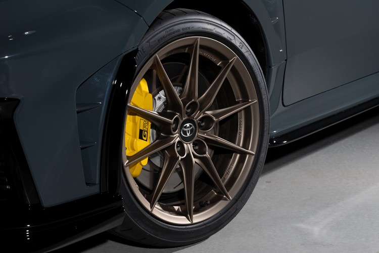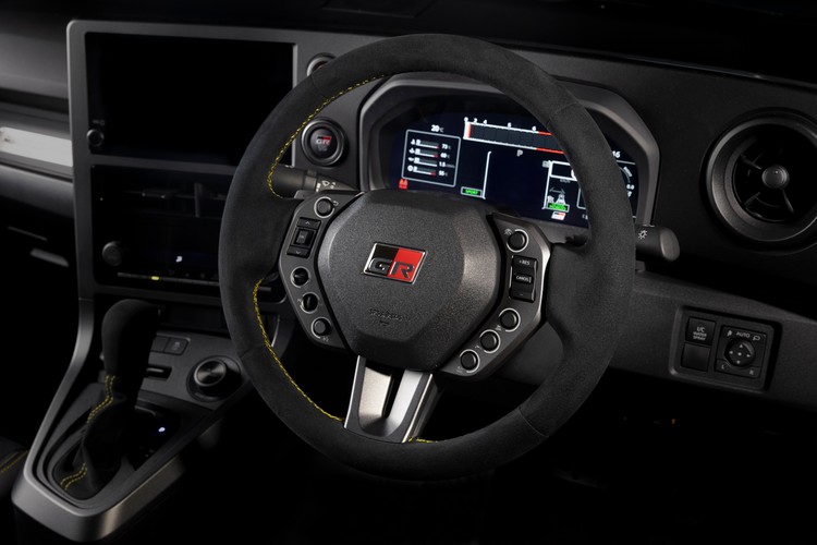 外觀上,Morizo RR 的賽道氣勢同樣一眼可辨。車輛配備碳纖維後尾翼與前下擾流,兼顧提升下壓力與降低車重的效果。黃色煞車卡鉗在 Gravel Khaki 車色襯托下更顯搶眼;內裝則有細節升級,其中最引人注目的便是專屬的麂皮包覆賽車方向盤,其外徑更小,換檔撥片和轉向開關的形狀也進行了調整。借鑒 GR Yaris Rally 2 的設計,各切換開關採用獨立控制設計。