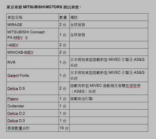 全球車壇焦點,第42屆東京車展即將於12/3東京有明Big Sight會議中心正式開幕; MITSUBISHI將首度展出全球戰略車型“MIRAGE”以及環保SUV車型“MITSUBISHI Concept PX-MiEV Ⅱ。這兩款重點車型充份展現了MITSUBISHI中期經營計畫「JUMP2013」中對於未來產品戰略規劃的兩大核心概念, “以新興市場為中心的全球戰略車型”以及“環保車型”。 另外,MITSUBISHI還將同步展出今年12月將在日本市場上市的輕型商用電動汽車“MINICAB-MiEV”;已在日本歐洲等市場銷售,並預計在今年年底北美市場上市的新世代電動車“i-MiEV”;搭載三菱汽車最新節油新技術的新型MIVEC*和智慧怠速啟停系統Auto Stop & Go(AS&G)的RVR compact SUV;以及採用環保柴油引擎的PAJERO SUV等車型,展車數量共計15台。