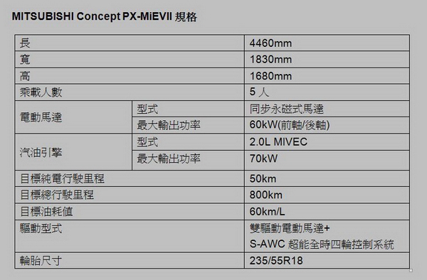 MITSUBISHI Concept PX-MiEVII![]() MITSUBISHI Concept PX-MiEV II是為了提供更長行駛距離所設計的中型插電式油電混合車(plug-in hybrid PHEV),利用MITSUBISHI發展成熟的電動車技術,在SUV上提供了電動車的環保動能、優異的油耗表現與寧靜的車室等多功能用途。