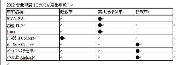 ![]() TOYOTA總代理和泰汽車於展前發表中發表了2012台北車展的主題車款,TOYOTA今年將以『New Experience of Good Future-您美好未來的全新生活體驗』為主題,將展出包括全球首部全電動SUV-RAV4 EV、新世代最佳節能車輛Prius PHV、充滿活力/時尚/個性化的全新綠能小車-Prius c、體現完美駕馭的新世代後驅雙門跑車-FT-86 II Concept及多輛新款車。