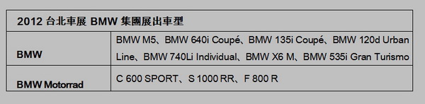 BMW總代理汎德公司將於2012台北車展中,首次在台發表全新BMW M5純種四門跑車,以狂放不羈的爆發動力,滿足所有車迷的感官享受!此外,甫於2011年盛大上市的全新BMW 640i雙門跑車、全新BMW 120d Urban Line五門掀背跑車、全新 BMW 135i雙門跑車,將以風馳電掣的勁跑快意,擄獲車迷的心。 而坐擁王者之尊的全新BMW 740Li Individual、全新X6M、和全新535i Gran Turismo跨界跑旅也將隆重現身,增添大氣風範。除了BMW汽車之外,重機車迷朋友們心中第一品牌的BMW Motorrad,也將一併動感登場!BMW Motorrad將在2012台北車展上,呈獻搭載全新動力的C 600 SPORT大型速可達、賽道王者S 1000 RR以及街頭猛將F 800 R,及將佔領所有目光焦點!