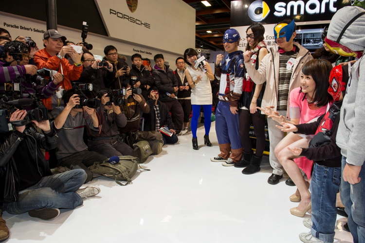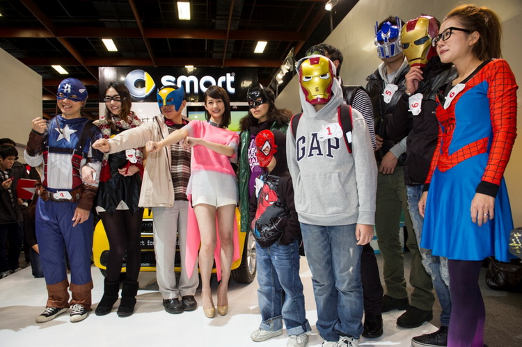 搞怪精神無人能敵的smart品牌,延續今年中smart以「城市英雄」所號召的車友大會師精神,於車展中號召了車迷朋友前來變裝赴會,果然吸引了各界英雄,如好萊塢英雄電影的蝙蝠俠、美國隊長、鋼鐵人,還有蜘蛛人等等!而以超能甜心身分擔任一日店長的當紅女星簡嫚書,則是以一襲可愛甜美的超能力女孩裝扮,難得展現她嬌小卻比例勻稱的迷人身材!讓首日開放一般民眾進場的台北車展,充滿了無窮活力!